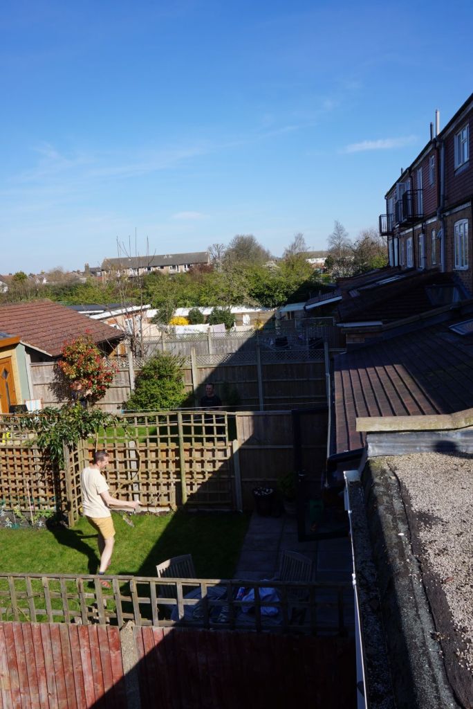We still hear the occasional plane–they have been taking off to the east due to a persistent weather pattern that has brought strong winds off the North Sea and brilliantly clear skies, marred by only the occasional contrail. The UK has now moved closer to a full lock down, something that was necessary to overcome the cavalier attitude too many people have toward COVID-19. Life is still not as restricted as it is in many other European countries, but still more so than in much of the U.S. The ambit of our London adventure keeps shrinking. So, just as Thoreau “traveled a good deal in Concord” we will be more studiously exploring our nearby–for now including the various parks and Wandle River path, but which could shrink to our little backyard, now sporting some kale, lettuce, and radishes and some perennial flowering plants (cowslip and primrose), all an emphatic vote for the future! Our neighbors (left) made a badminton net of their fence this morning.