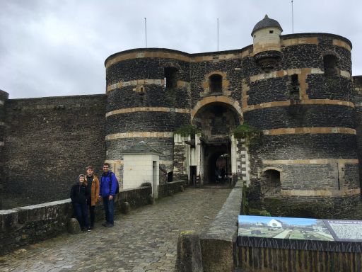 Our final full day in France we left Yann and family in peace and headed to Angers for part of the day. Angers is the closest city to Nantes with one of the famous châteaux of the Loire Valley. The Château d’Angers is a massive fortress (the main gate at right) built in stages beginning in the 9th century. Blowing light rain limited the amount of time we wanted to spend on the parapets, though the view was impressive. There were even pretty substantial gardens at various points inside the walls. The interior rooms had displays related to both the history of the castle and the those who occupied it, including John the Good and his son Louis, Count of Anjou, who commissioned the famous “Apocalypse Tapestry.”