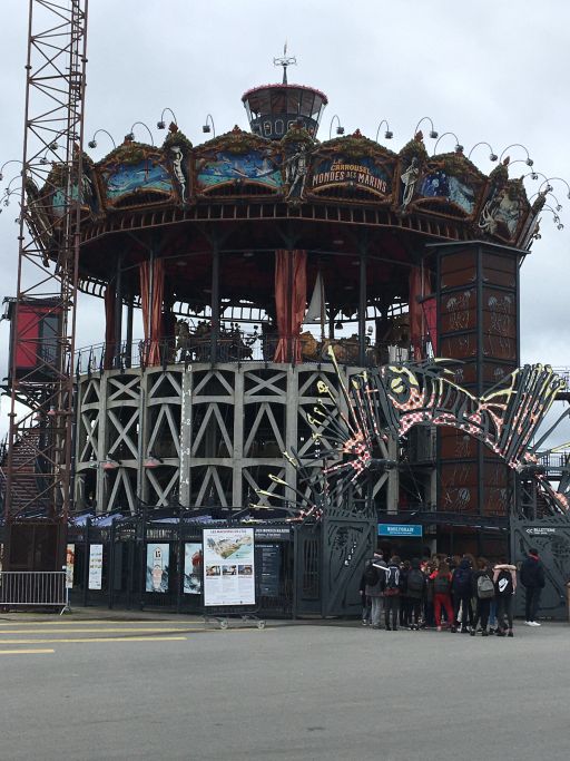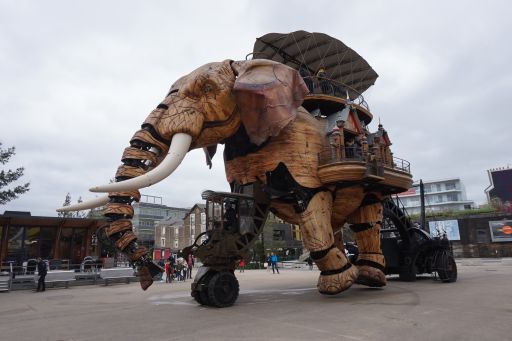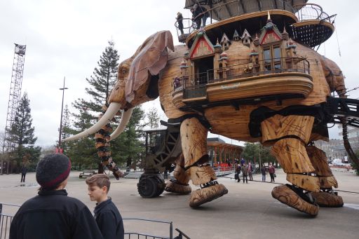 On the left of a Jules Verns themed, three story carousel, one of the three parts of a project called Les Machines de l’Ile, the Machines of the Island. (Jules Vernes is a native of Nantes) The Loire River passed around an island in the middle of Nante on which this project can be found. Les Machines is a project that is part sculpture, part artwork, part robot, part steam-punk, part immitative of nature, it’s impossible to describe with one idea. Its artistic vision has created mechanical animals and trees and this carousel to entertain and astound visitors. They are currently working on The Tree of Hebron, a multi-story animated tree with birds and animals of all kinds that will be built on the north bank of the river. The models for these are what compose the gallery below.